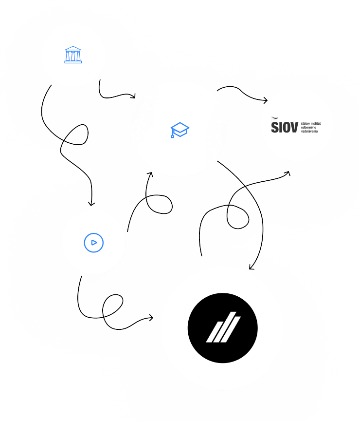 Stredné, vysoké školy, zamestnávateľov, kraje, mestá, štátne inštitúcie (ŠIOV, CVTI SR...), združenia (RUZ, ZAP, APZ) a populárne riešenia ako: Leaf, Growni, Junior Academy, doučma.sk, KickResume...